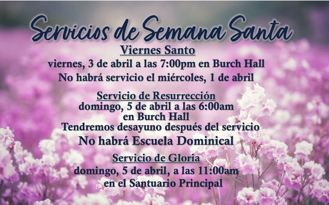 Servicio de Estudio Biblico y Oración en Burch Hall los días miércoles de 7:00pm-8:30pm